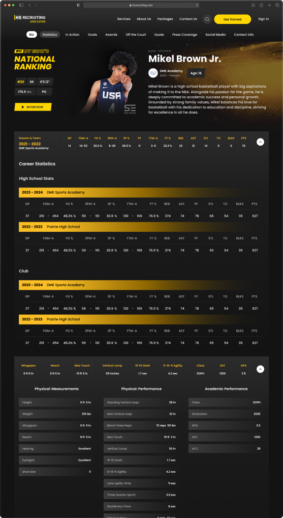 Your player page shows your personal, academic, and athletic highlights including stats, media, news, and playing history.